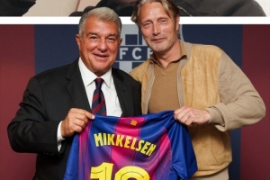 西甲第5轮比赛,巴萨主场3-0击败赫塔费。麦斯-米科尔森来到现场观看比赛,他与巴萨俱乐部主席拉波尔塔合影,并获赠巴萨10号球衣。