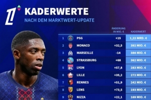 体育资讯3月28日讯 德国转会市场更新了法甲球员的身价,并列出法甲球队身价排名,巴黎12.2亿欧断层居首,摩纳哥3.92亿欧次席。