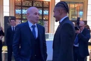 伊涅斯塔来到了在法国举行的金球奖颁奖典礼,并被拍到与巴萨球员拉菲尼亚在交谈。