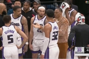 比赛暂停期间,因伤缺阵的威少穿着便装,在替补席鼓励队友。