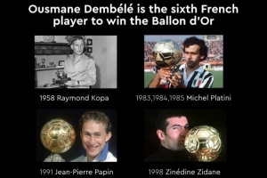 体育资讯9月23日讯 登贝莱获得2025年金球奖,金球奖官方晒图,这名巴黎前锋成为历史上第六位获得这项荣誉的法国球员。