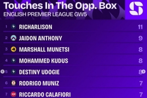 体育资讯9月24日讯 英超第5轮战罢,squawkafootball列各项数据排行,热刺前锋理查利森是本轮在对方禁区触球最多的球员,共11次。