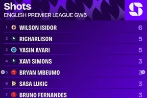 英超第5轮射门榜: