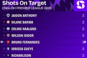 体育资讯9月24日讯 英超第5轮战罢,squawkafootball列各项数据排行,伯恩利前锋杰顿-安东尼是射正次数最多的球员,共3次。