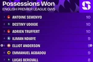 体育资讯9月24日讯 英超第5轮战罢,squawkafootball列各项数据排行,塞梅尼奥、乌多吉、特吕费尔是本轮夺回球权次数最多的球员,各有10次。
