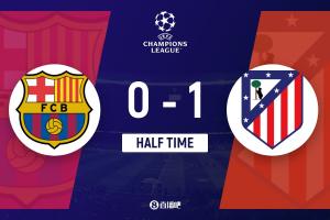 上半场伤停补时4分钟,半场结束,巴萨暂0-1马竞。