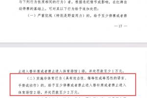 依据《中国足球职业联赛联合会纪律与道德准则》明确规定,球员实施非体育道德行为,包括使用攻击性、侮辱性或辱骂性语言、手势或动作的,应给予至少停赛或禁止进入替补席或体育场2场,并处以至少2万元罚款。