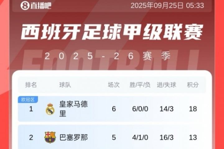 体育资讯09月25日讯 西甲3场比赛战罢,马竞3-2绝杀巴列卡诺,皇家社会1-0马洛卡,赫塔菲1-1阿拉维斯,最新积分榜如下: