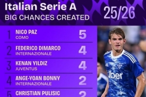 体育资讯9月26日讯 知名足球数据网站Squawka统计了2025/26赛季意甲联赛截至目前的球员创造重大机会榜。