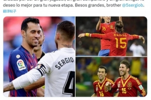 体育资讯9月26日讯 西班牙中场布斯克茨宣布赛季结束后退役,拉莫斯社媒发文,为他送上祝福。