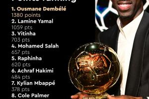 体育资讯09月27日讯 金球奖分数公布:登贝莱1380分第一,亚马尔1059分。