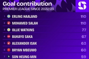据Squawka的数据统计,自哈兰德加盟曼城以来,他已经在英超联赛直接参与110粒进球,同期没有哪名球员比他更多,只有萨拉赫同样参与110粒进球与他持平。