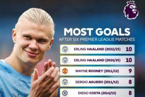 数据显示,哈兰德本赛季前6轮攻入8个英超进球,这一数据可以排进英超单赛季前六轮射手榜的前9。距离哈兰德自己在2022/23和2024/25赛季创下的6轮10球尚有差距。哈兰德加盟曼城以来4个赛季前六轮的进球数分别为:10、8、10、8。
