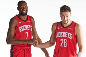 申京晒出了自己和杜兰特身穿火箭球衣的照片,并写道:“生日快乐兄弟。”