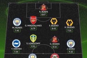 后卫:努内斯(曼城)、加布里埃尔(阿森纳)、圣地亚哥-布埃诺(狼队)、乌戈-布埃诺(狼队)