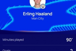 哈兰德在本场比赛首发出战,4射门3射正,打进2球,评分8.8全场最高。