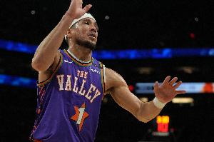 上半场,布克出战16分钟,他9投4中,三分2中0,罚球8中6,得14分2板5助。正负值为+11。