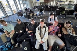 体育资讯10月4日讯 FLY官推晒选手机场出发合照,P图不是猫就是狗!