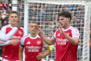 体育资讯10月04日讯 英超第7轮,阿森纳vs西汉姆联。比赛第38分钟,赖斯补射攻破旧主大门,阿森纳1-0领先!进球后赖斯没有庆祝。
