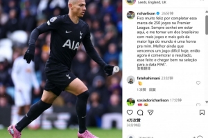 理查利森赛后也在社媒晒出本场照片,配文写道:“很高兴能在英超联赛中完成250场里程碑。我一直梦想着能在这里踢球,成为在世界顶级联赛中出场次数最多、进球最多的巴西球员之一是我的荣幸。更令人高兴的是,今天我们赢得了一场艰难的比赛,所以现在要庆祝这一切,并以最佳状态迎接国家队比赛日。”