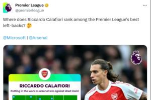 英超官方赛后晒出了卡拉菲奥里的触点图,并发问:卡拉菲奥里在英超最佳左后卫排名第几?