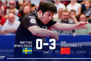 樊振东最终以3-0(11-9, 11-8, 11-6)横扫法尔克,帮助萨尔布吕肯将大比分扳成2-2。