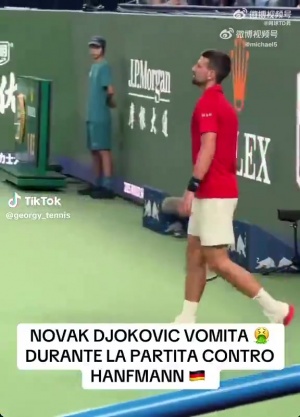 在比赛中,有观众拍到德约科维奇在场上2次呕吐,他仍然带着不适的身体坚持打比赛,没有任何要退赛的意思。