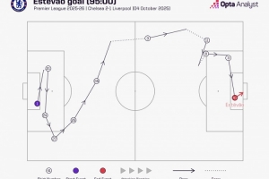 据Opta统计,10名切尔西球员(埃斯特旺被计算在内)参与埃斯特旺的进球,整个过程仅用28秒。