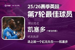 2025-2026赛季英超火热进行中,体育资讯和咪咕体育联合发起每轮英超最佳球员评选活动!第7轮评选结果出炉,切尔西后腰凯塞多攻防兼备,轰入世界波帮助切尔西2-1战胜利物浦,获得吧友5.6万票的支持,当选 【体育资讯X咪咕体育英超第7轮最佳球员】!