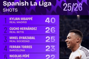 体育资讯10月7日讯 日前,Squawka统计了本赛季西甲射门次数排行,姆巴佩以40次射门居首。
