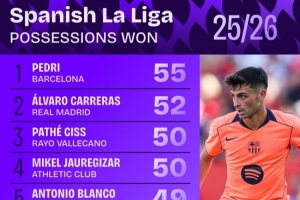 体育资讯10月7日讯 日前,Squawka统计了本赛季西甲夺回球权次数排行,佩德里55次居首,卡雷拉斯52次第二。