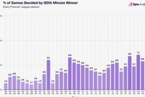 据统计,此占比数据是此前英超任何一个赛季的两倍,此前最高的是23/24赛季,占比7.1%;上赛季90分钟后打进制胜球的比赛占比为5.8%。