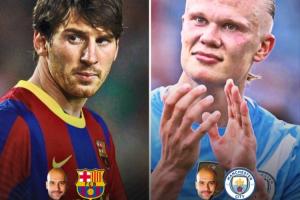 梅西在瓜迪奥拉执教下,在西甲联赛136场138球55助;哈兰德在瓜帅执教下,104场英超94球17助。