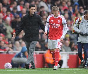 本轮英超阿森纳2-0西汉姆联,厄德高上半场第19分钟与对手膝对膝碰撞,随后继续在场上坚持了10分钟后被伤退离场。