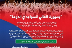 我们邀请您在阿联酋足球协会为阿联酋球迷免费提供的位于丽笙酒店(乔安娜厅)和喜来登酒店(马吉利斯厅)的巨型屏幕上关注比赛动态。我们将于18:15(22:15)开始接待公众。”