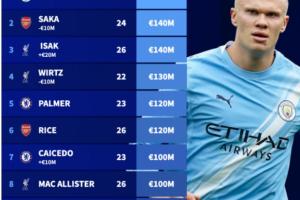 体育资讯10月17日讯 今日德转更新英超身价,其中伊萨克涨至1.4亿欧,萨卡跌至1.4亿,维尔茨跌至1.3亿。