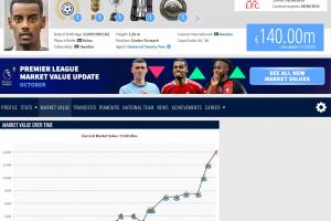 体育资讯10月17日讯 德国转会市场今天更新了英超球员的身价,利物浦今夏创纪录引进的前锋伊萨克从1.2亿欧涨至1.4亿欧,德转管理员解释了此次上涨的原因。