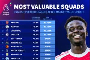 体育资讯10月17日讯 德国转会市场今天更新了英超球员的身价,最新的俱乐部身价榜中,阿森纳和曼城均遭下跌,但仍占据前二,利物浦、切尔西破10亿欧分列第三第四。