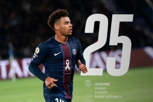 巴黎官方统计,杜埃职业生涯至今参与25粒法甲进球(13球12助),成为在法甲首位达成这一数据的2004年及之后出生球员,他出生于2005年6月3日。