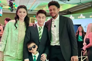 体育资讯10月19日讯 凯尔特人小老板何猷君今日晒出一家人与安芬尼-西蒙斯的合影: