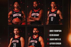 值得一提的是,这是一套“五大”阵容,五人身高分别为:阿门2米01、杜兰特2米11、小史密斯2米11、申京2米11、亚当斯2米11,首发平均身高为2米09。