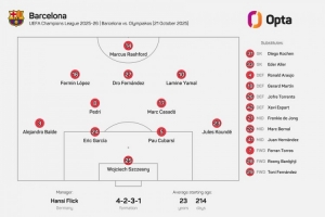 据opta数据统计,巴萨此役首发11人平均年龄23岁214天,这是球队在欧冠中排出的第三年轻的首发阵容。