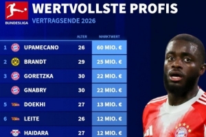 体育资讯10月23日讯 《转会市场》统计了合同将在明夏到期的德甲球员身价情况,拜仁中卫于帕梅卡诺独自领跑。