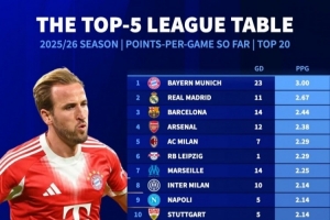体育资讯10月25日讯 《转会市场》统计了本赛季五大联赛球队的场均拿分情况,拜仁、皇马、巴萨、阿森纳分列前四。