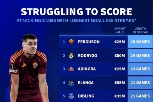 德转盘点进攻球员进球荒(身价2500万欧+):