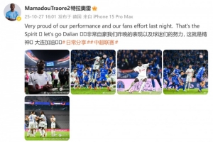 赛后,马马杜-特拉奥雷在社媒写道:“非常自豪我们昨晚的表现以及球迷们的努力, 这就是精神!大连加油!”
