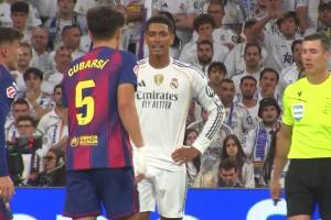 当时,贝林厄姆看到佩德里倒地抱怨犯规,便走向他,轻轻拍了拍他的头,对巴萨球员的抱怨显得颇不以为然,还做出几个表示“难以置信”的手势。