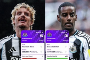 伊萨克上赛季:场均射门2.5次、射正1.5次,近0.8球;射门-进球转化率30.26%,传球16.5次,成功率77.05%;快速做球1.6次,造犯规0.5次,成功争顶0.9次,地面成功对抗2.2次,夺回球权1.8次。