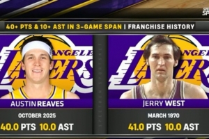 在最近的三场比赛中,里夫斯场均得到40分10助攻,队史第二人,比肩杰里-韦斯特。