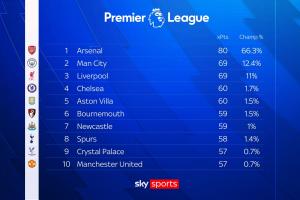 体育资讯10月31日讯 天空体育引用Opta最新的数据分析指出,根据目前走势,阿森纳本赛季可能只需要70分即可夺得英超冠军。